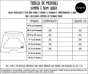 | Tamanho | 1 a 2 anos, 2 a 3 anos, 3 a 4 anos, 4 a 5 anos, 6 a 7 anos |