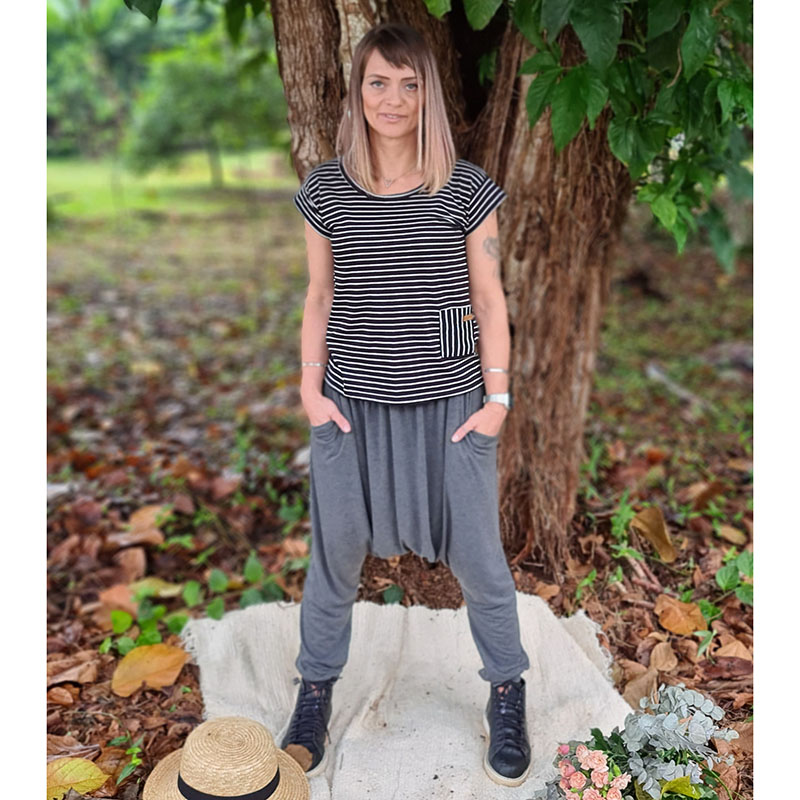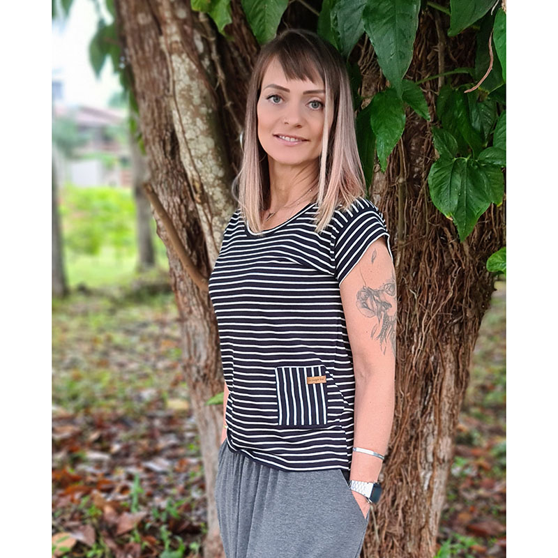 BLUSA CO ESTAMPA DE LISTRAS, BOLOS FRONTAL, MANGA JAPONESA. 100%ALGODÃO