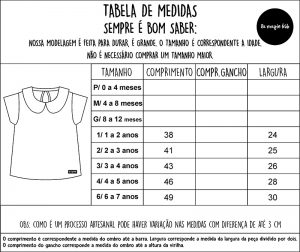| Tamanho | 1 a 2 anos, 4 a 5 anos, 6 a 7 anos |