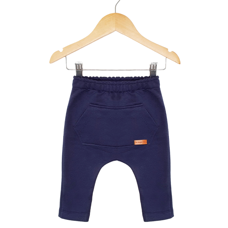CALÇA SARUEL EM MOLETOM MARINHO . DETALHE DE BOLSO FRONTAL CANGURÚ