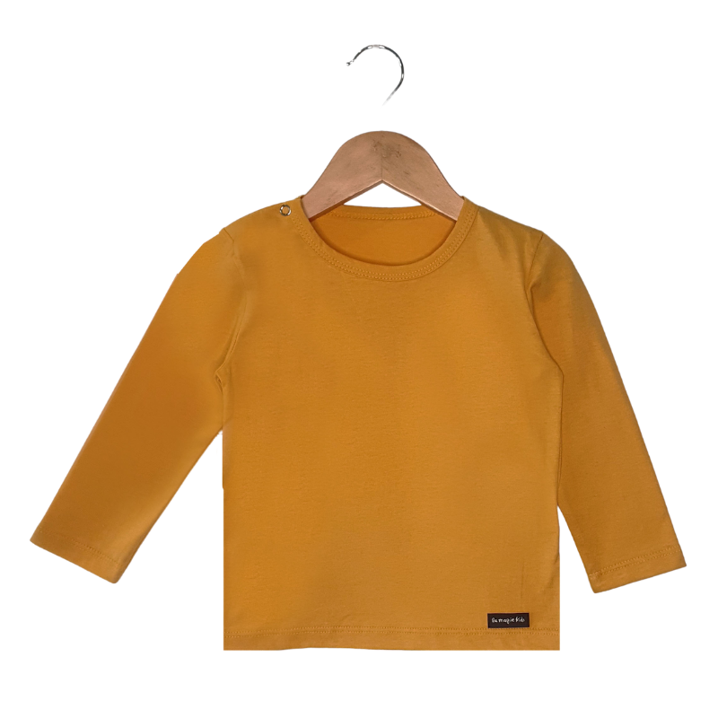 CAMISETA EM ALHA DE ALGODÃO COM BOLSO FRONTAL COR MOSTARDA. ABERTURA NO DECOTE NOS TAMANHO E 1A2ANOS E 2A3ANOS