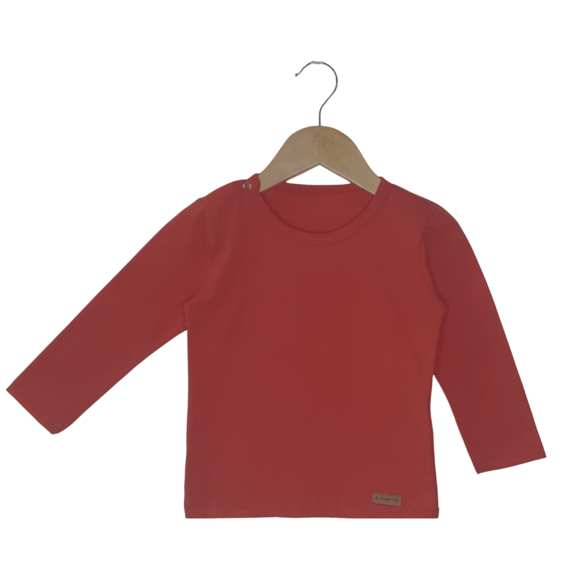 CAMISETA EM ALHA DE ALGODÃO COM BOLSO FRONTAL COR VERMELHO. ABERTURA NO DECOTE NOS TAMANHO E 1A2ANOS E 2A3ANOS