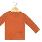 CAMISETA EM ALHA DE ALGODÃO COM BOLSO FRONTAL COR TELHA. ABERTURA NO DECOTE NOS TAMANHO E 1A2ANOS E 2A3ANOS