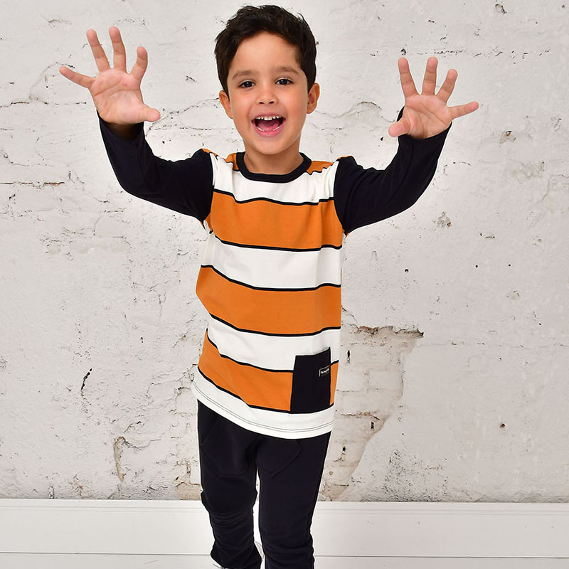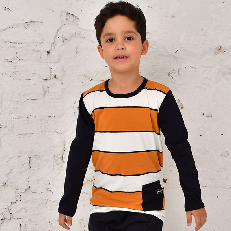 Camiseta em Malha de Algodão com Listras Caramelo . Bolso Frontal e Manga Contrastante. Abertura no Decote nos Tamanhos 1 e 2 anos