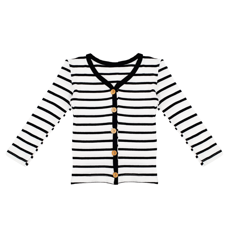 Cardigan Listrado Preto e Branco em Malha Canelada com Elstano, Abertura Frontal com Botões de Madeira.