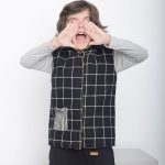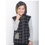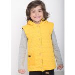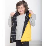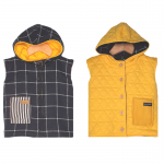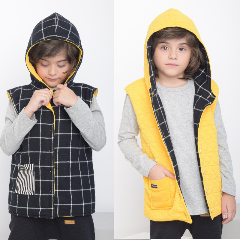 COLETE DUPLA FACE 2 EM 1 COM CAPUZ. LADO A EM TECIDO DE MATELASSÊ AMARELO, BOLSO FRONTAL. LADO B EM TECIDO DE ALGODÃO XADREZ PRETO E BRANCO E BOLSO LISTRADO