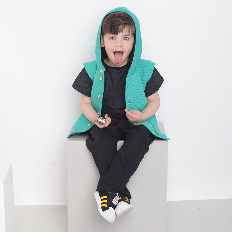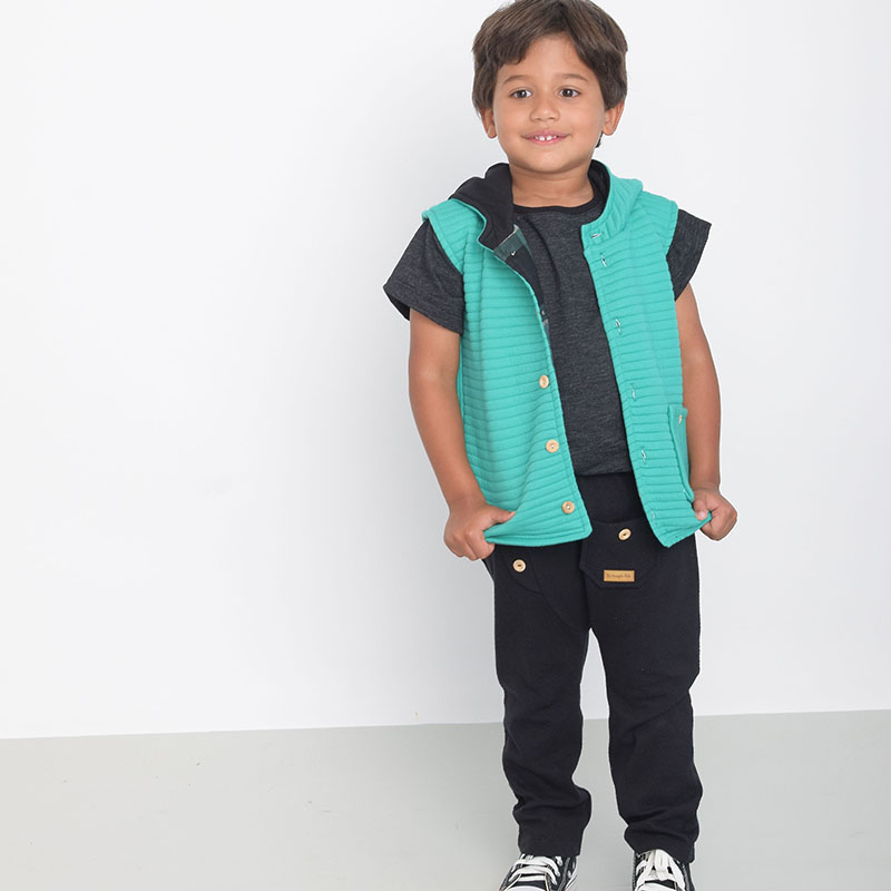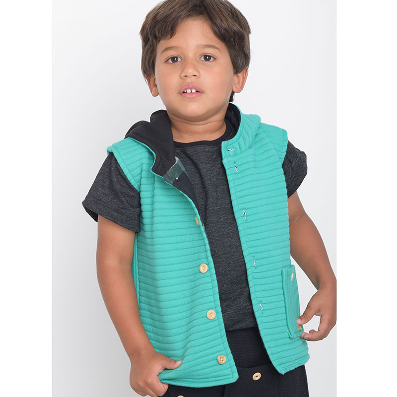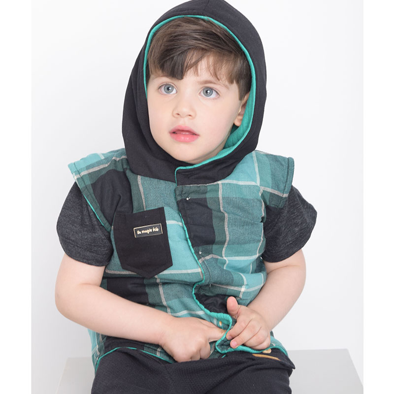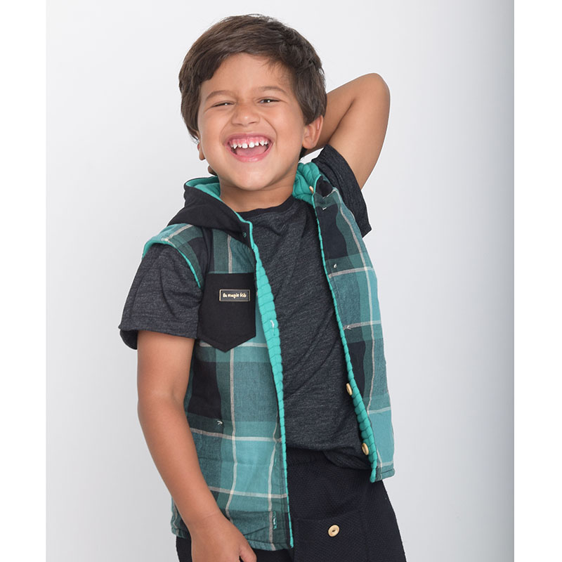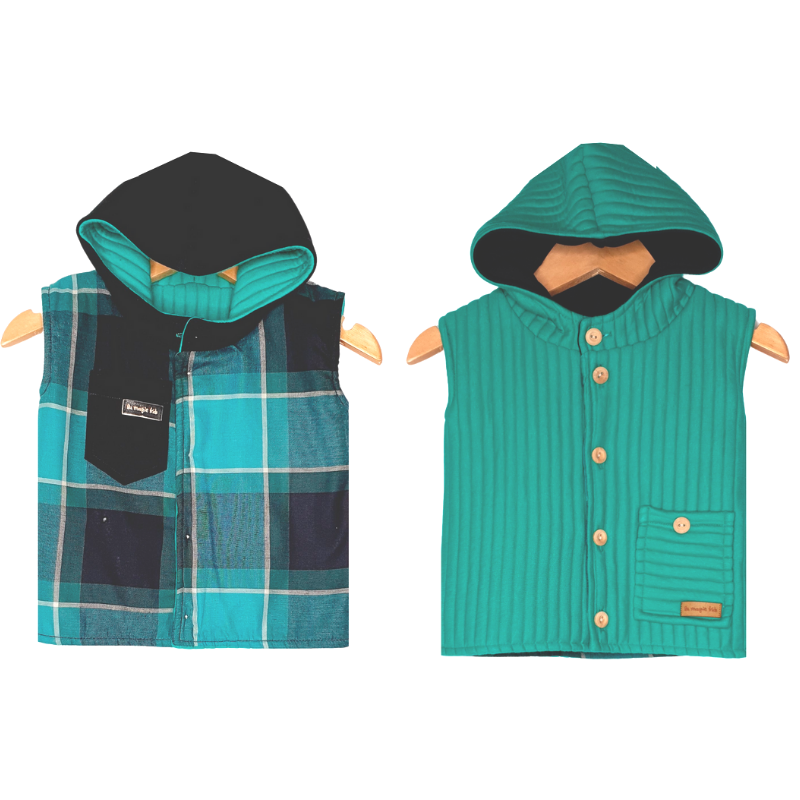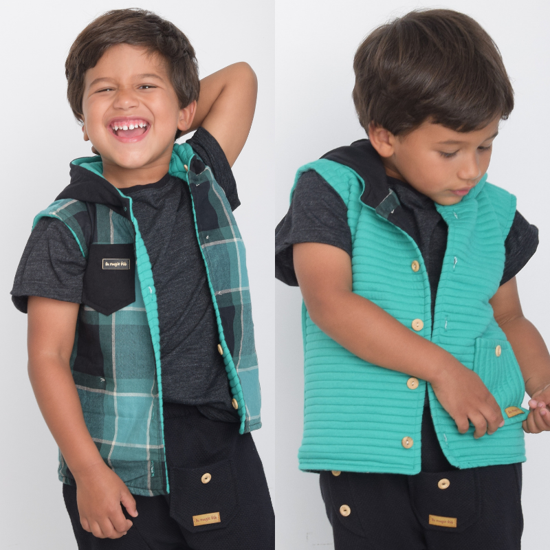 COLETE DUPLA FACE 2 EM 1 COM CAPUZ. LADO A EM TECIDO DE MATELASSÊ VERDE, BOLSO FRONTAL. LADO B EM TECIDO DE ALGODÃO XADREZ VERDE E BOLSO PRETO