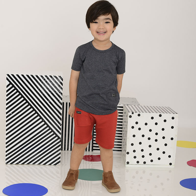 Conjunto de duas Peças. Camiseta em malha de algodão com Bolso Frontal. (Abertura no Decote nos tamanhos 1 e 2 anos. Bermuda em Moletinho de Algodão com Bolso Frontal. Elástico Interno
