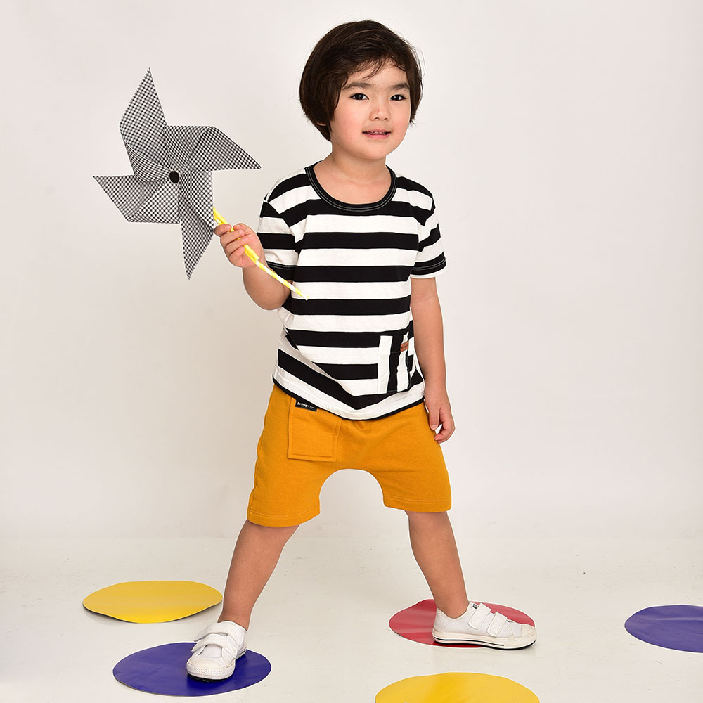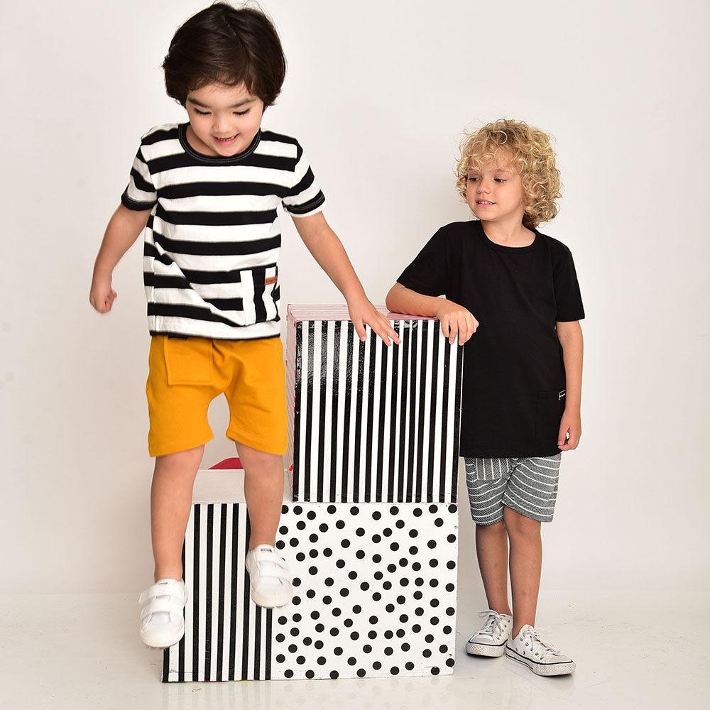 Conjunto de duas Peças. Camiseta em malha de algodão com Bolso Frontal, e estampa de Listras P&b. (Abertura no Decote nos tamanhos 1 e 2 anos. Bermuda em Moletom de Algodão com Bolso Frontal. Elástico Interno