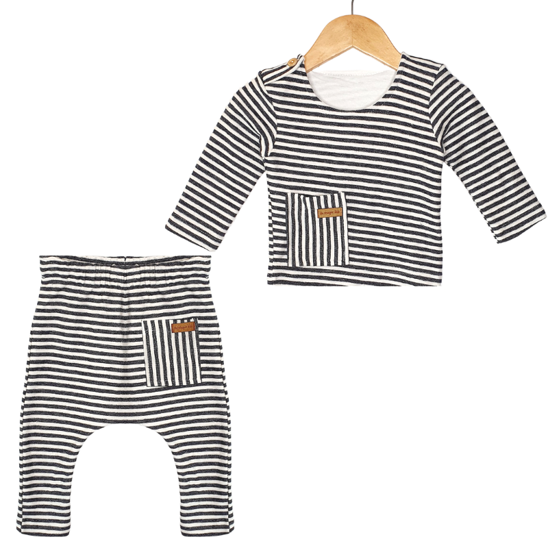 CONJUNTO EM MOLETOM COM LISTRAINHAS MARINHO. BLUSA COM ABERTURA NO OMBRO COM BOTÃO DE MADEIRA. BOLSO FRONTAL. CALÇA SARUEL COM BOLSO FRONTAL