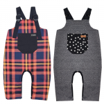 Reversível, 2 em 1. Lado A em Xadrez Colorido. Lado B em Picket de Malha Cinza com Bolsos Listrados. Alças Reguláveis Amarelas. Abertura na entrepernas com botões de Pressão nos Tamanhos G ao 2 anos.