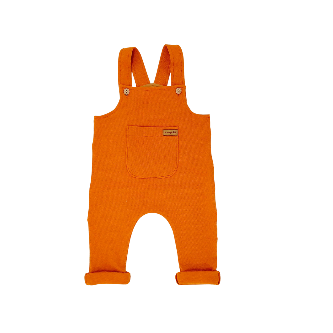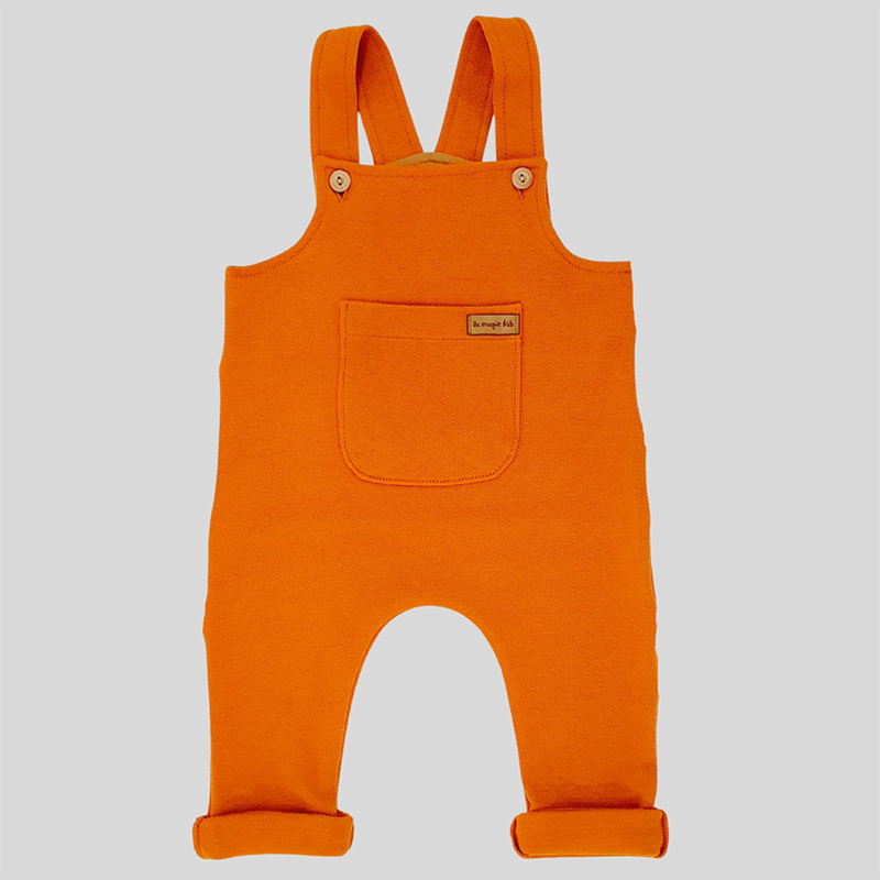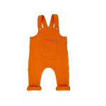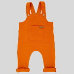 JARDINEIRA EM PICKET DE MOLETOM LARANJA. ALÇAS COM BOTÕES DE MADEIRA, BOLSO FRONTAL