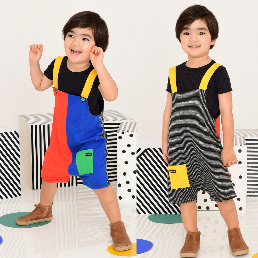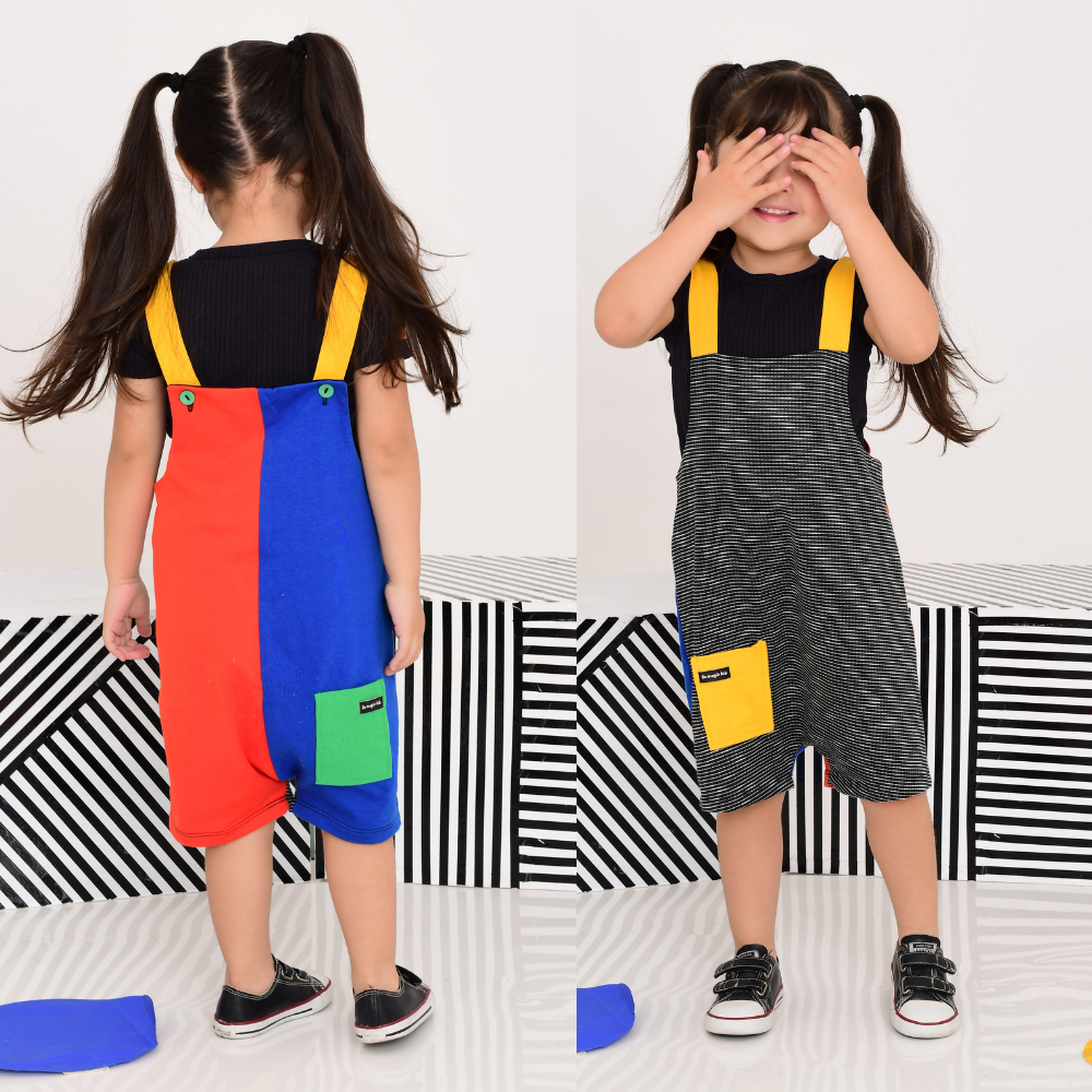 Jardineira colorida Com Detalahes contrastantes. Pode ser usada de tráz pra frente. Alças Reguláveis com Boões. Detalhes de 2 Bolsos. Abertura na Entrepernas nos tamanhos Baby (p a G) com botões de pressão.