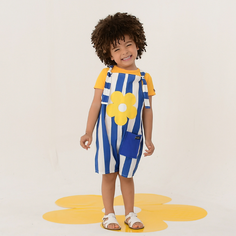 Jardineira Listras Azuis com Bolso + Flor Amarela