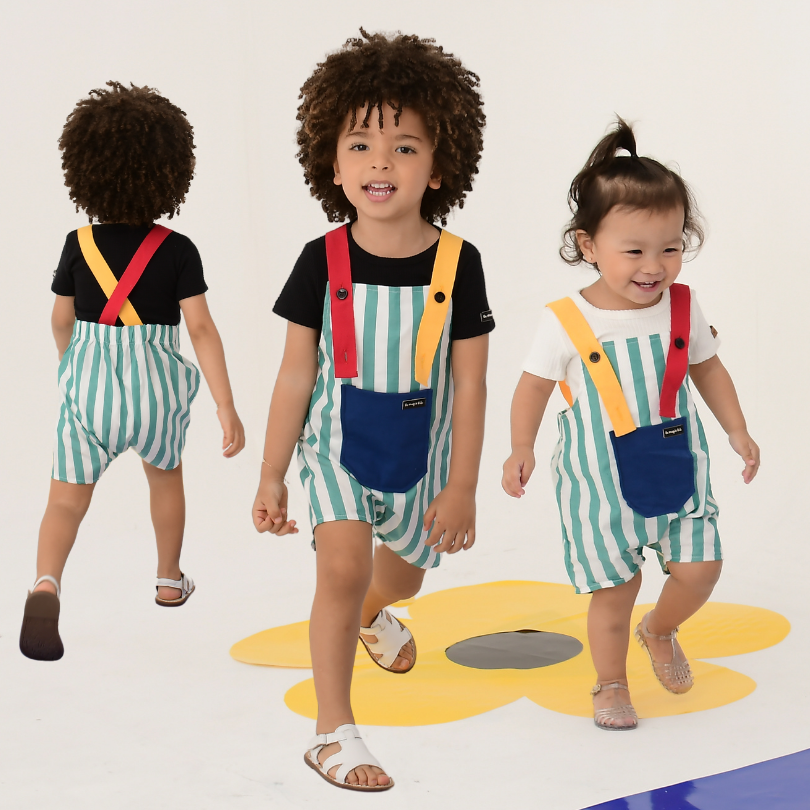 Jardineira Listras Verdes Detalhes Multicoloridos