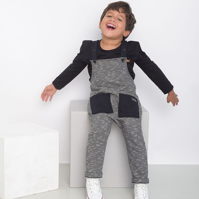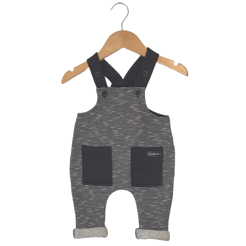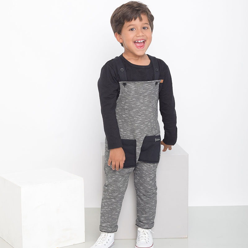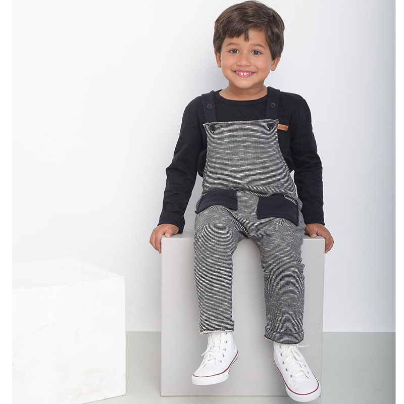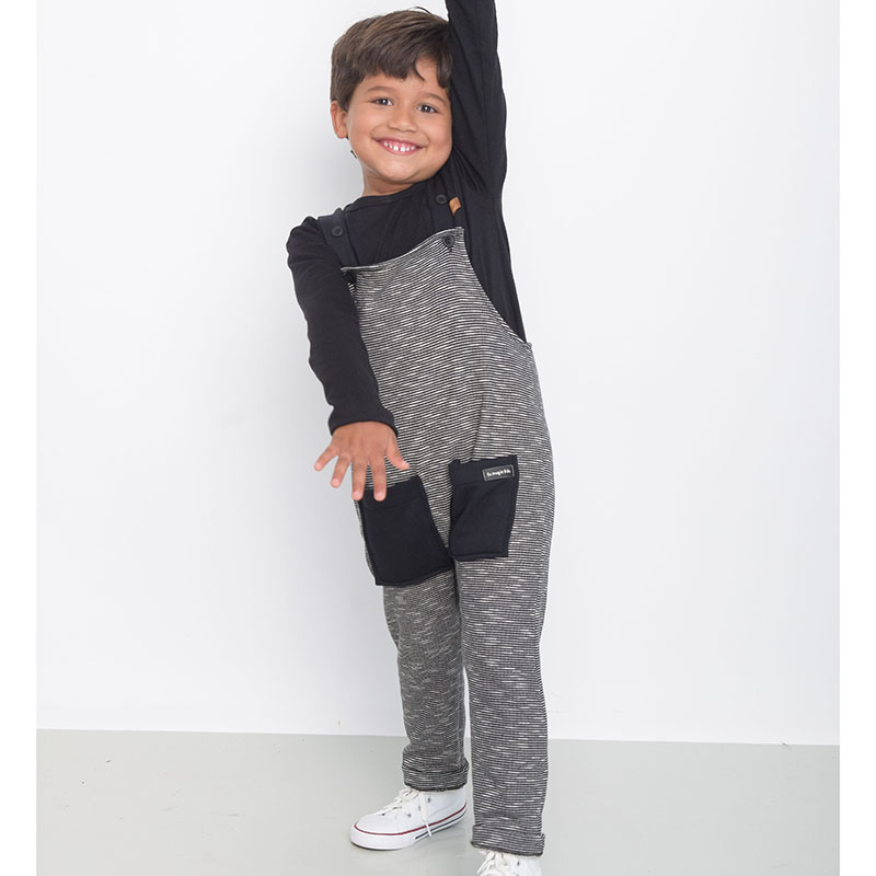 JARDINEIRA EM MOLETOM COM MINI LISTRAS PRETA E CINZA COM TEXTURA E. ALÇAS REGULÁVEIS COM BOTÕES EXTRAS. DETALHES EM PRETO. 2 BOLSOS FRONTAIS