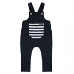 | Em Moletinho com Elastano Comfy Preto com Bolsos Listrados. Alças com Regulagem de Botões e Caseados |