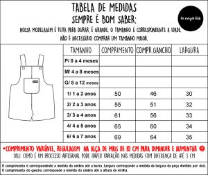 | Tamanho | 1 a 2 anos, 2 a 3 anos, 3 a 4 anos, 4 a 5 anos |