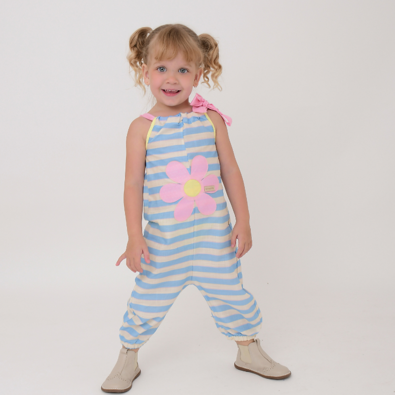 Macacão Laço Ombro Listras Azuis Com flor Rosa