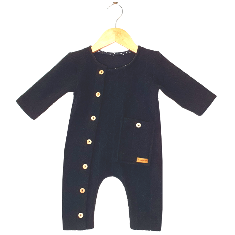 MACACÃO EM SOFT COM TEXTURA. ABERTURA COM BOTÕES DE MADEIRA. DETALHE DE BOLSO FRONTAL