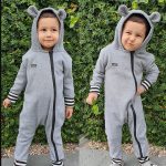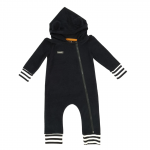 MACACÃO EM PLUSC PRETO COM PELÚCIA, ZÍPER FRONAL. BARRAS LISTRADAS EM PRETO E BRANCO. CAPUZ COM ORELHAS DE URSINHO