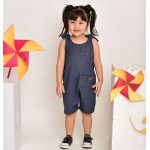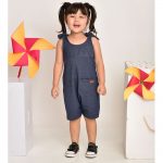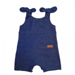 Macaquinho em Jeans Fake de Algodão. Bolsinho Frontal. Abertura na entrepernas com botões de pressão. Detalhe de amarração nos ombros com nózinho.