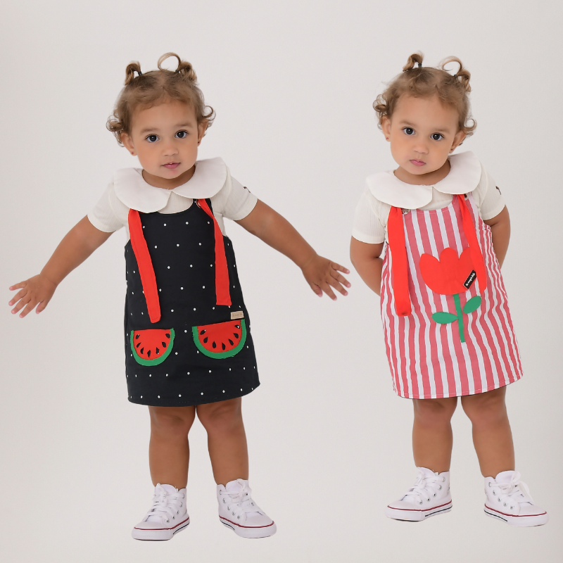 Vestido Dupla Face Poá Melancia + Listras e Flor