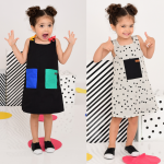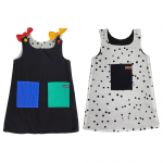 Vestido em algodão 2 em 1. Pode ser usado dos dois lados. Lado A= poá off e Preto com detalehs de bolso contrastante. Lado B= Tecido sarja leve, com bolsos coloridos. Detalhes de amarração removível nos ombros.