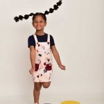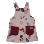 vestido em Sarja de algodão estampada. Detalhe de Bolsos frontais Contranstantes. Alças reguláveis com botões.